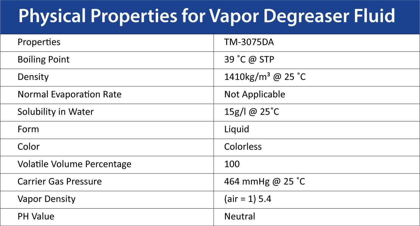 While all three of Tyrell Chemical’s Heat Transfer Fluid lines are formulated for use as vapor degreasing fluids, we also have an alternative formulation to hydrochlorofluorocarbon (HCFC) and perfluorocarbon (PFC) fluids. TM-3075DA is a proprietary fluid that allows for a wide safety profile and serves as a more cost effective and environmentally friendly option for degreasing applications.